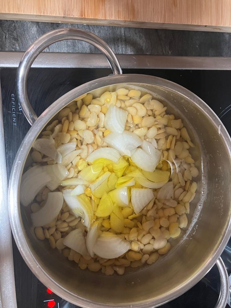 10 dakika kaynar suda beklettiğiniz ayıklanmış baklayı, birkaç defa yıkayıp suyunu süzün. Soğan, şeker, tuz ve zeytinyağı ekleyin. Üzerine 2 su bardağından biraz az su ekleyin ve kaynayana kadar yüksek ateşte kaynadıktan sonra düşük ateşte, ara ara karıştırılarak püre haline getirin.
